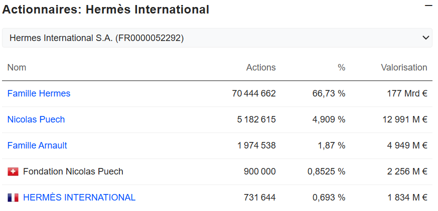 截至2025年3月12日的爱马仕主要股东构成,皮埃什当时仍被列为最大个人股东/图源:Zonebourse