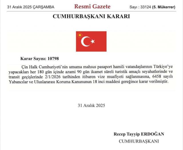 当地时间 12 月 31 日,土耳其《官方公报》发布总统令,宣布自 2026 年 1 月 2 日起,对持中国普通护照的公民实行免签入境政策。